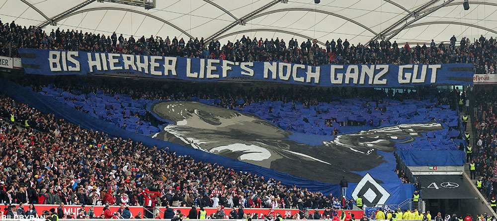 Hamburgsupportrarna hade en text som betyder i stil med "Hittills är allt bra" - detta speglar att de som nykomlingar gjort det bra efter den långa ökenvandringen i Zweite.